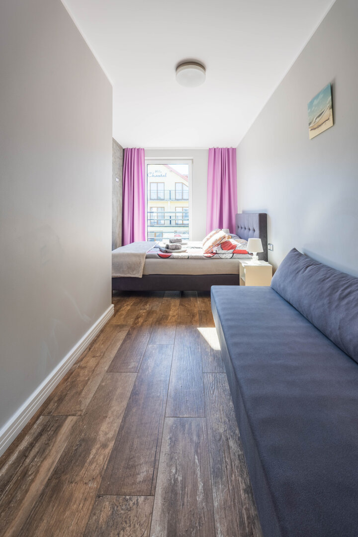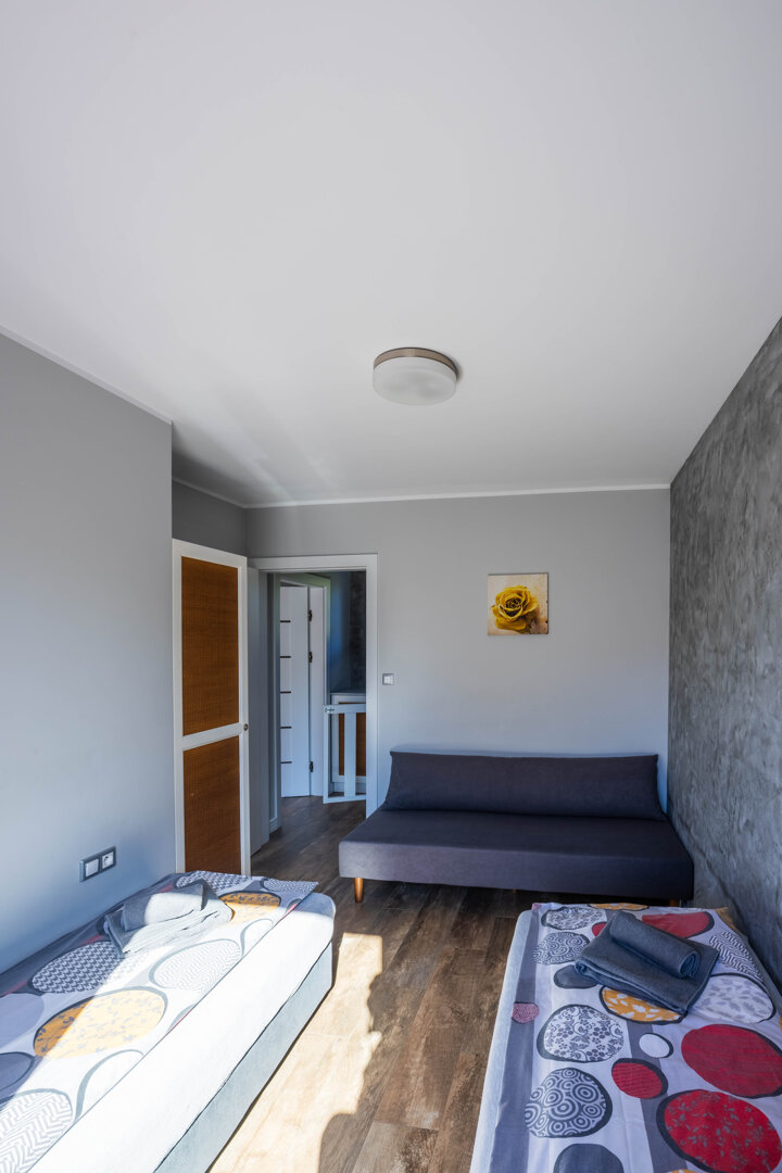 Liczba łóżek: 1 duże łóżko podwójne, 1 łóżko podwójne (Double) lub 2 łóżka pojedyńcze (Twin) - do decyzji gościa, 1 sofa rozkładana (Sofa Bed)