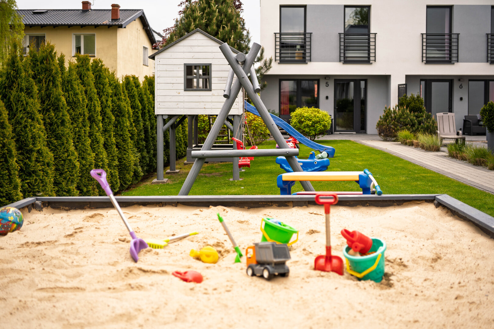 Domek nr 5 posiada dodatkowe wyposażenie: Kokon, parasol tarasowy, akcesoria plażowe oraz zabawki dla najmłodszych.